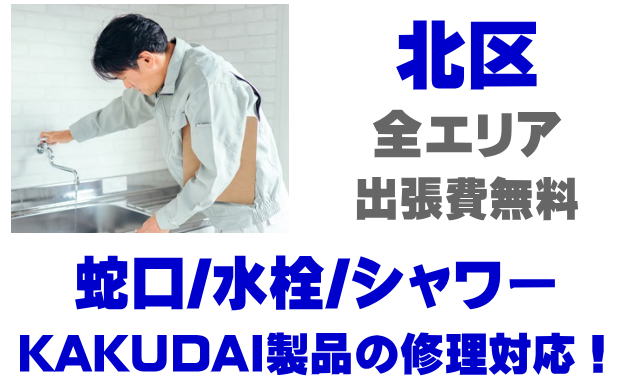 北区で水栓メーカーKAKUDAIの修理業者をお探しなら当社までお気軽にお問い合わせください。蛇口の水漏れ、シャワーの故障などカクダイ製に関するトラブルなら何でもご相談ください。